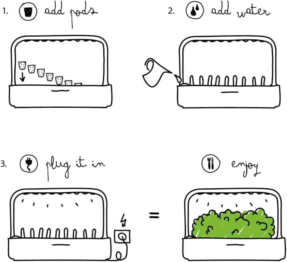 - Get growing right away - the kit comes with 3 mini tomato, 3 basil and 3 green lettuce pods.