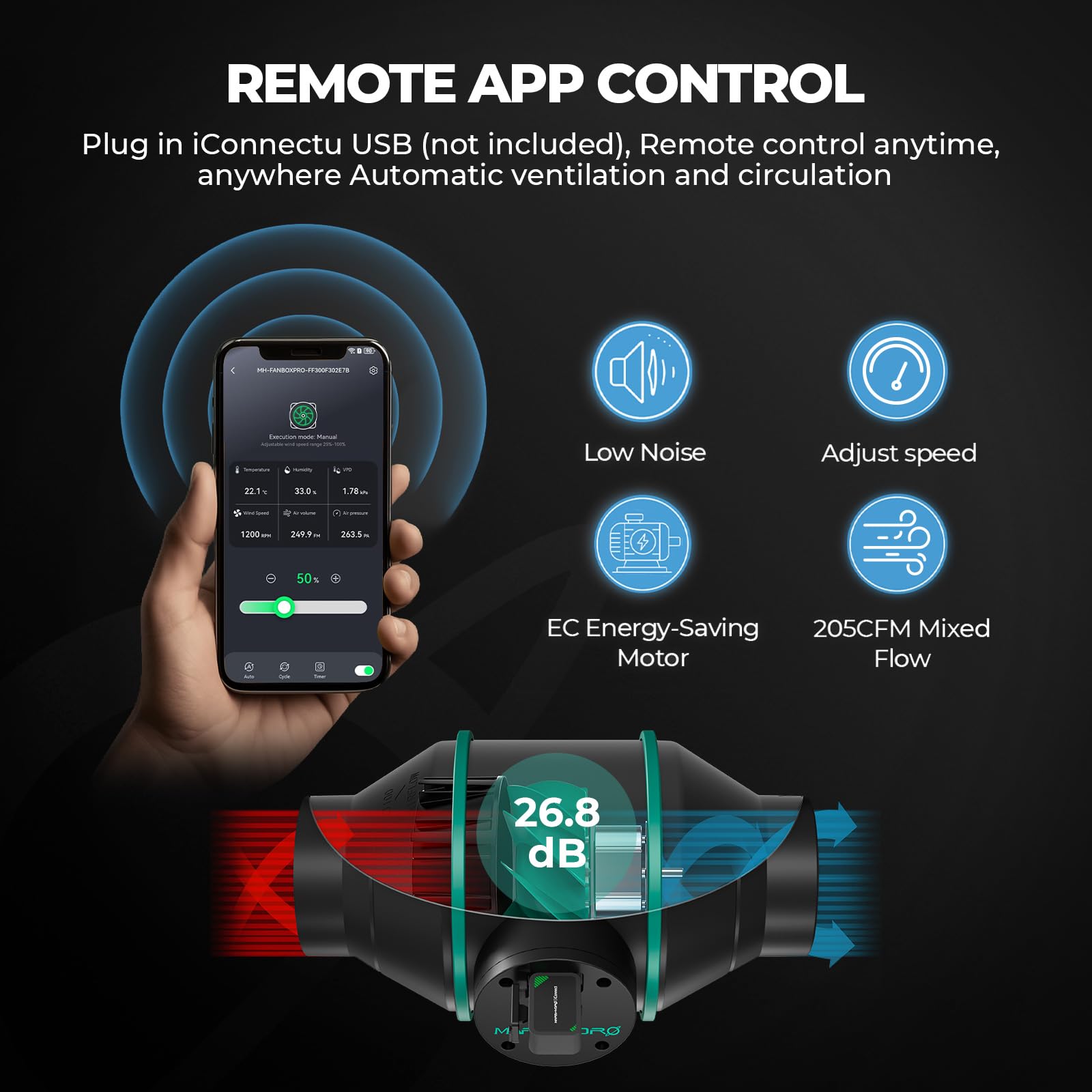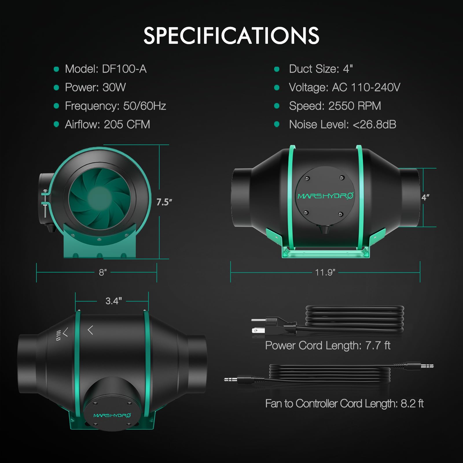 - 【EFFICIENT VENTILATION SYSTEM】MARS HYDRO inline fan blades have a mixed flow design to provide active air to your growing space, the fan runs at 2600 RPM and provides 205CFM of airflow. Only 26.8 dB noise. 1050+ RC 48 Australian Virgin Charcoal with 25ft length flex ducting.