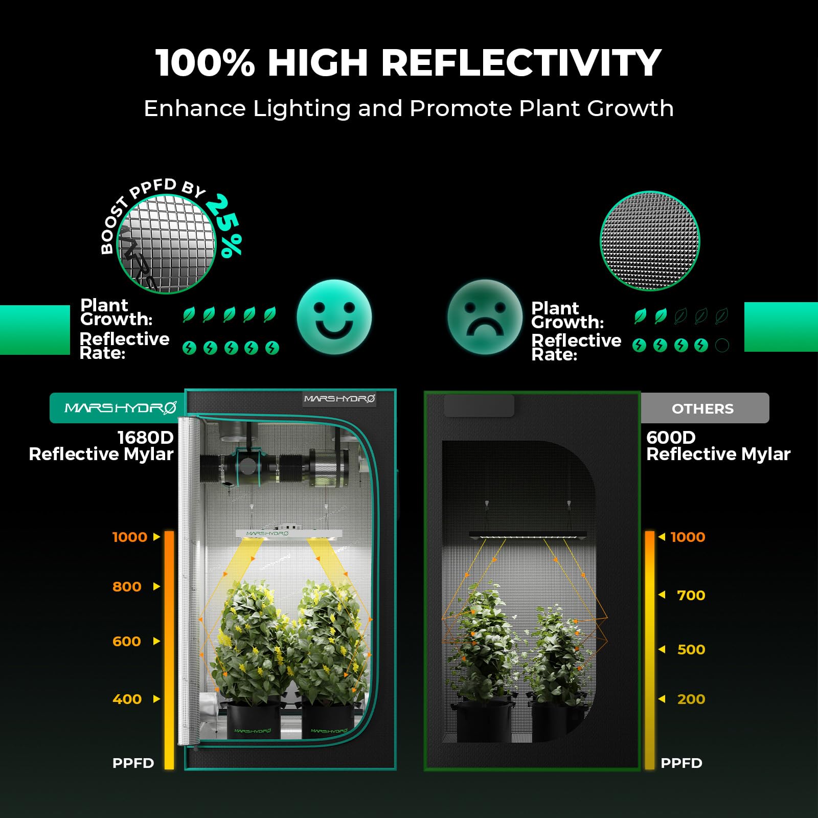 - 【HIGHER QUALITY GROW TENT】MARS HYDRO Grow Tent interior is highly reflective and density diamond mylar. An exclusive shade cloth is equipped on the stitching between zipper and canvas, avoiding any pinhole leaks. The 1680D canvas is double stitched, tear proof for perfect light locking and keeps 100% lighting beams inside.
