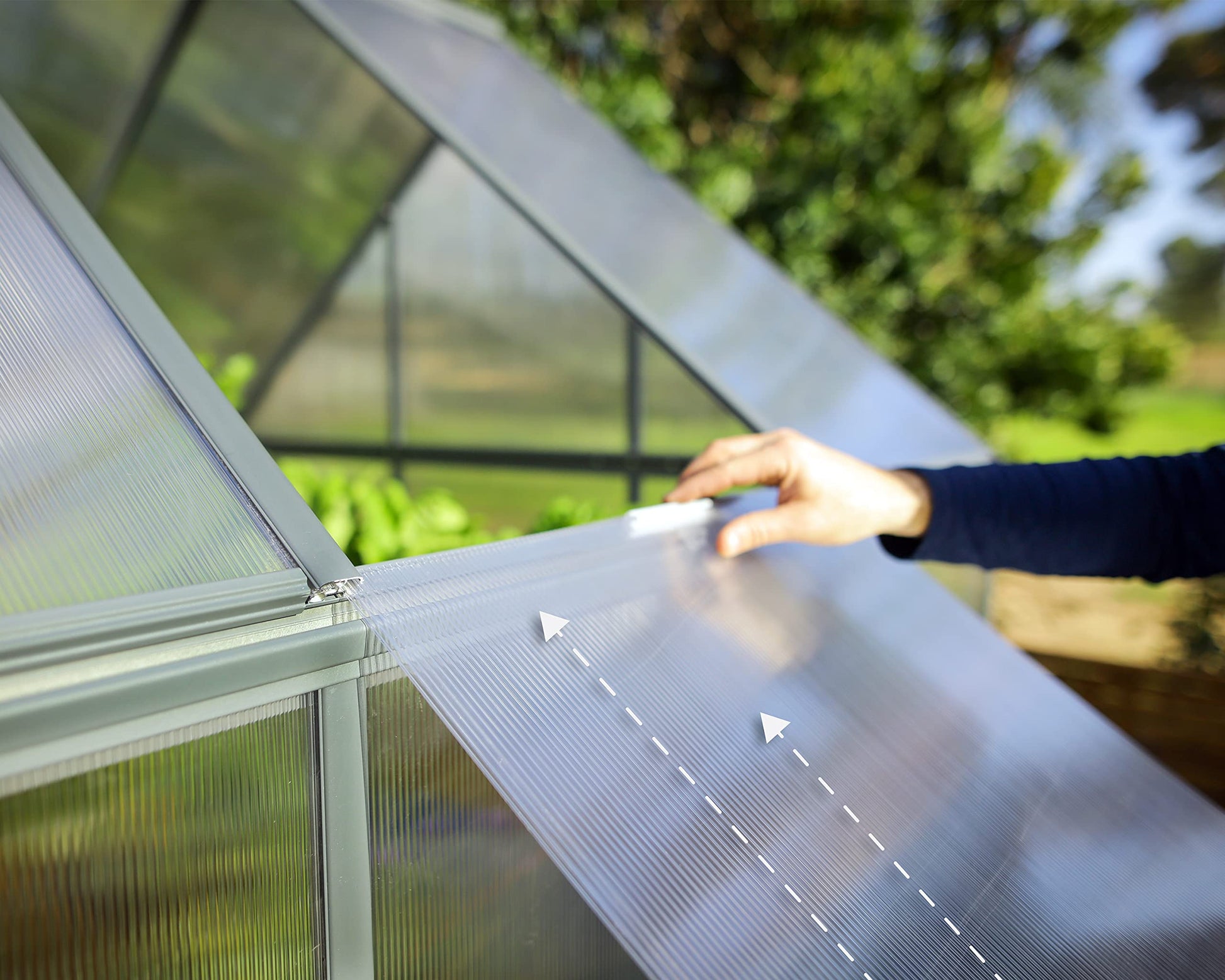 - Diffused Roof & Wall Panels: 4 mm twin-wall roof panels protect from strong sunlight exposure (82% light transmission) and protect plants from Fall frosts