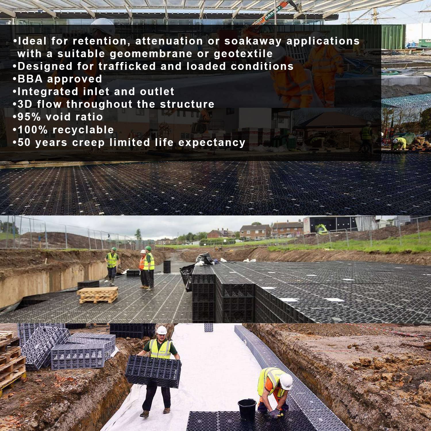- 61 tonnes/m2 compressive strength with a lightweight design. Suitable for water retention, attenuation and infiltration applications. Stop water pooling in one easy step.