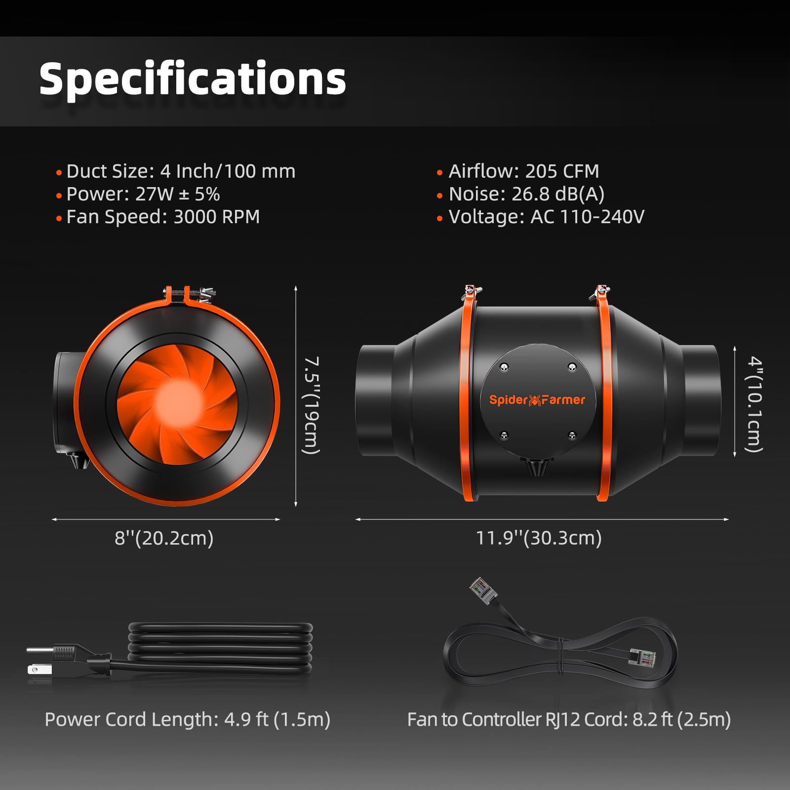Spider Farmer Air Filtration Kit 4 Inch, Inline Duct Fan with RJ12 Speed Humidity Controller, Carbon Filter Combo, 25 Ft Ducting, Ventilation System Kit for Grow Tents, Hydroponics, Indoor Gardening